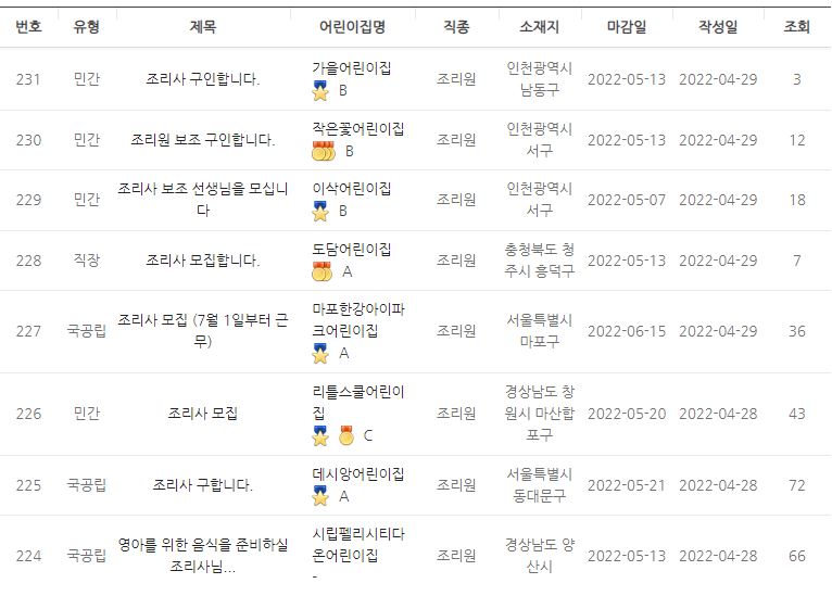 어린이집구인페이지에서는 조리사뿐만아니라 보육교사,대체교사,운전기사등 다양한 어린이집과 관련된 구인공고를 확인할수 있습니다.