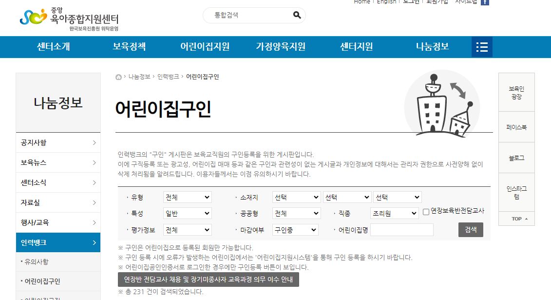 어린이집조리사 구인구직 정보는 잡코리아,워크넷등 많은 구직 사이트에서 찾아볼수 있지만 중앙육아종합지원센터홈페이지(central.childcare.go.kr)에서도 확인해볼수 있습니다.