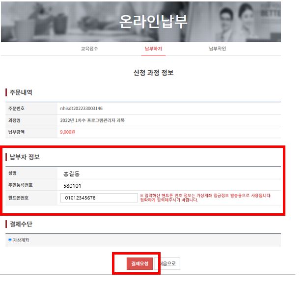 납부자 정보에서 나의 휴대폰 번호를 입력후 결제수단 [가상계좌]를 선택해 [결제 요청]을 클릭합니다.