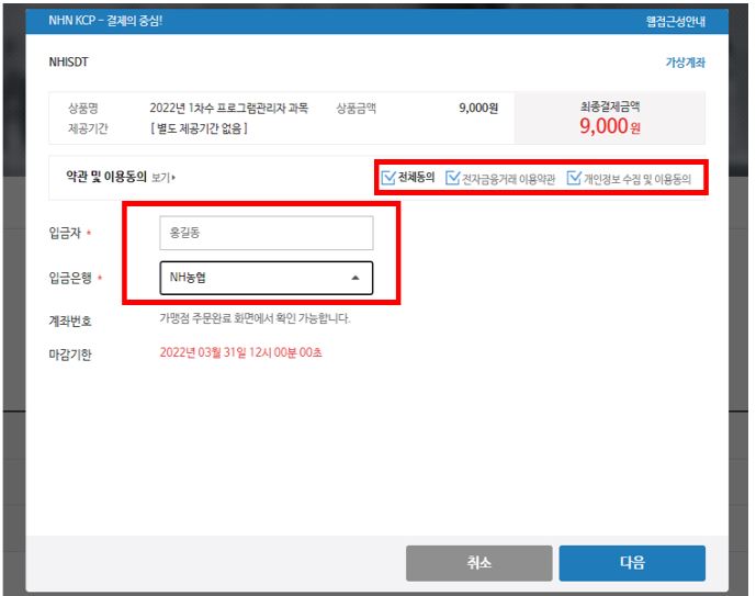 나타난 가상계좌로 교육비를 입금해야합니다.