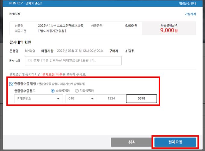 다음에서 [결제내역]을 확인후 형금영수증발행을 원하면 휴대폰 번호등을 입력후 [결제 요청]을 하면 가상계좌가 개설됩니다.