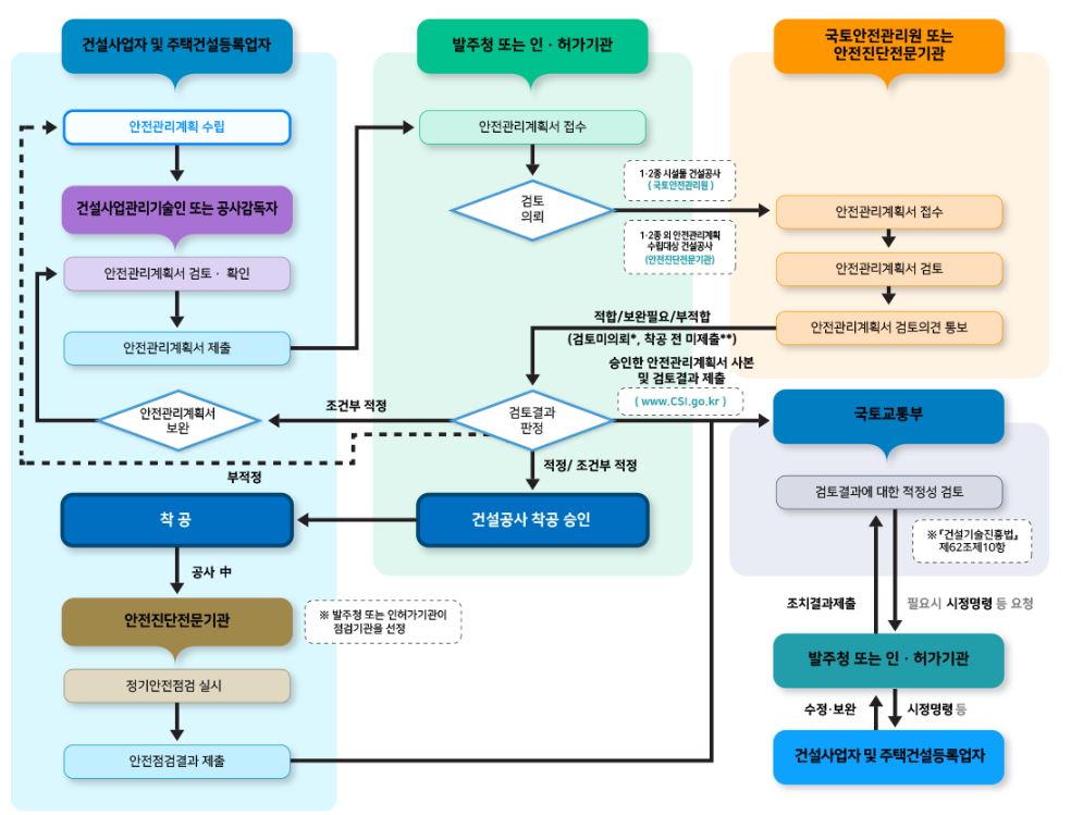 건설기술진흥법에 따라 건설사업자와 주택건설등록업자는 안전관리계획서를 작성하고 착공전에 발주자에제 제출하여 허가를 받아야 합니다. 발주청이 아닌 발주자는 미리 안전관리계획의 사본을 이허가기관 장에게 제출해 승인받아야 합니다.
