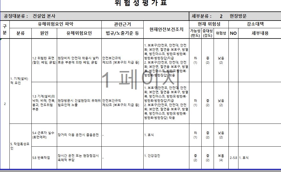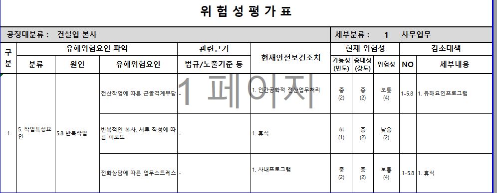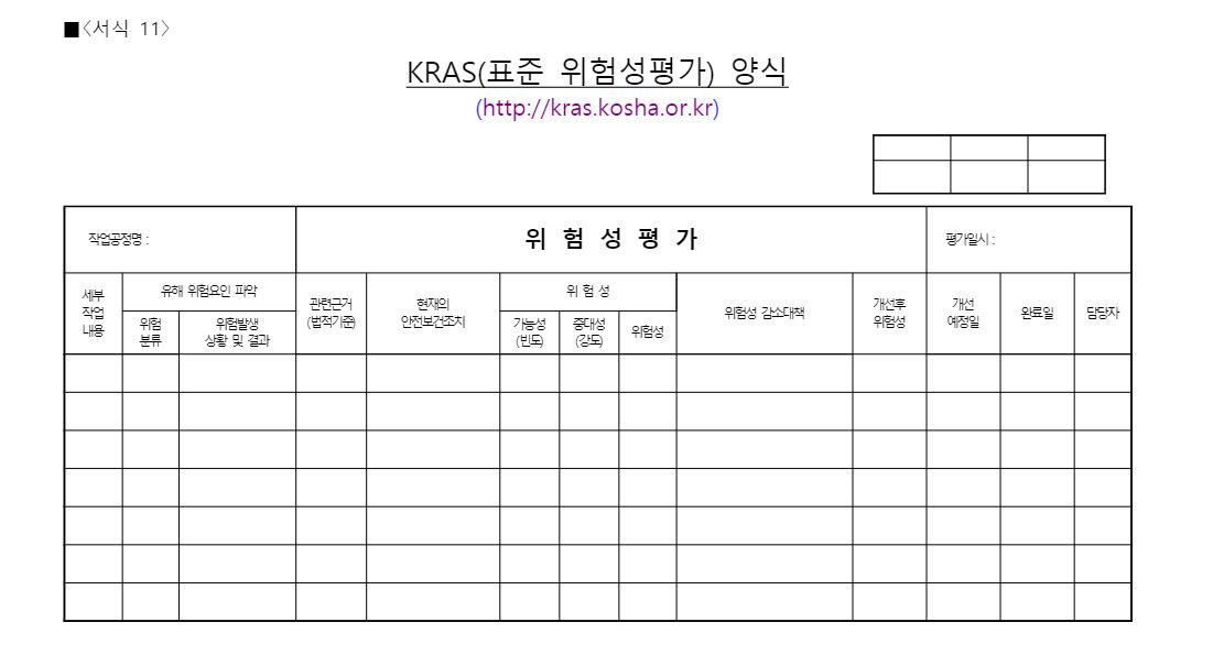 위 평가표는 표준 위험성 평가표이며 관련산업마다 조금씩 양식이 달라질수 있어서 기초자료로 활용하실수 있습니다.