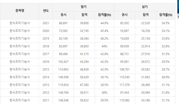한식조리기능사와 한식산업기사가 있으며 한식조리기능사 자격증이 매년 7~10만여명이 칠정도로 인기가 많은 자격증입니다.