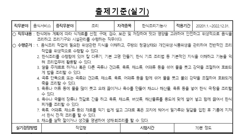 한식 조리사 자격증 시험일정,필기 실기 기출문제 요약(조리기능사 합격 요령 방법)