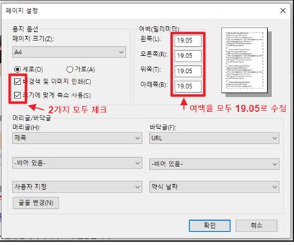 페이지 설정에서 배경색 및 이미지인쇄,크기에 맞춰 축소사용 2가지 모두 맞추고 여백을 19.05로 설정합니다.