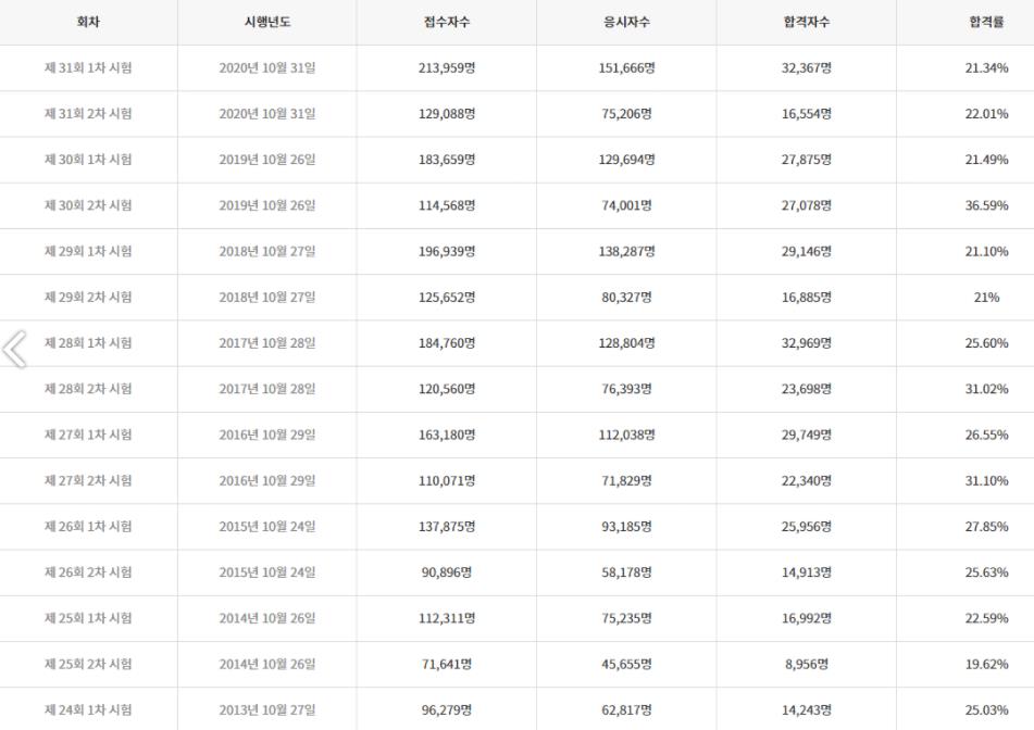 역대 2차 시험률 합격률을 보면 20~30%정도 내외로 1차에서 합격한사람들이 2차 시험에서 아래 합격률로 합격하였습니다.