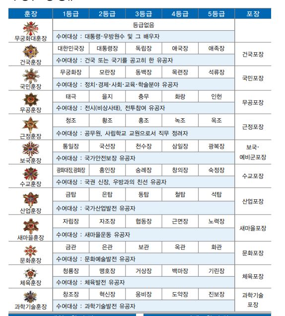 - 포장 : 훈장종류중 무궁화 대훈장 제외,예비군 포장 포함