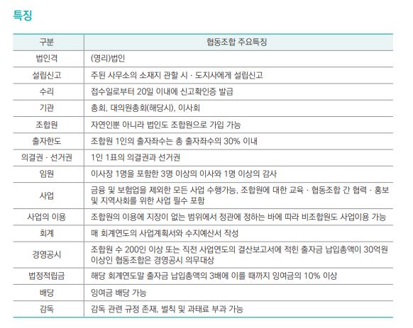 협동조합은 자발적이며 개방적인 조합원제도와 조합원에의한 민주적관리,경제적참여,자율과 독립,교육,훈련과 정보제공, 협동조합간 협동, 지역사회에 대한 기여등을 특징으로 하여 일반 주식회사와 차이가 있습니다.