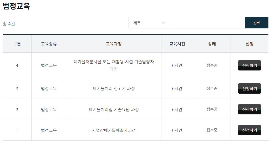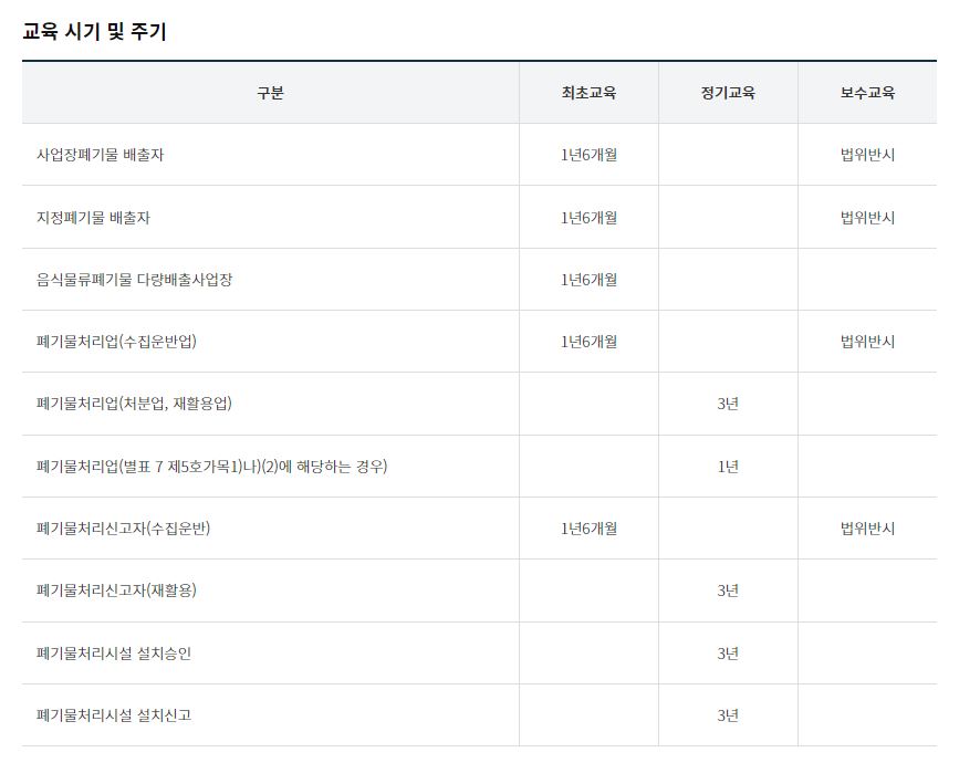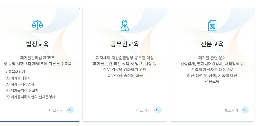 폐기물 처리담당자 법정교육에 대해서는 아래 페이지에서 자세히 확인하실수 있습니다.