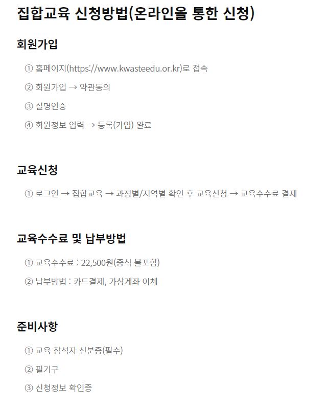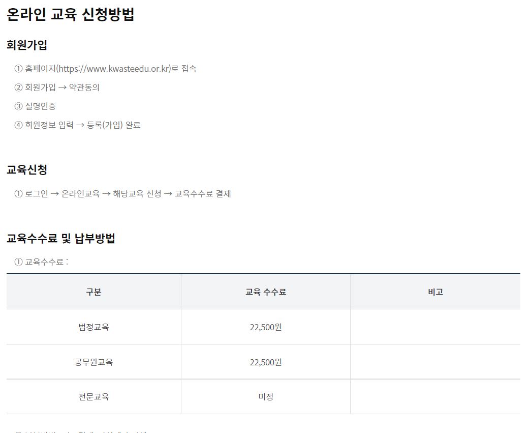 한국폐기물협회 온라인교육은 한국폐기물협회 교육홈페이지(www.kwasteedu.or.kr)에서 온라인이나 집합교육을 신청하여 이수할수 있습니다.