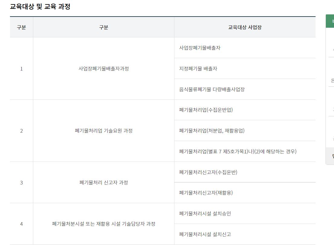 법정교육에는 폐기물처분시설 또는 재활용 시설기술담당자 과정과 폐기물처리 신고자 과정, 폐끼물처리업기술요원과정