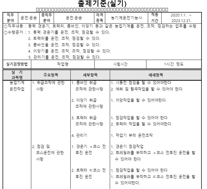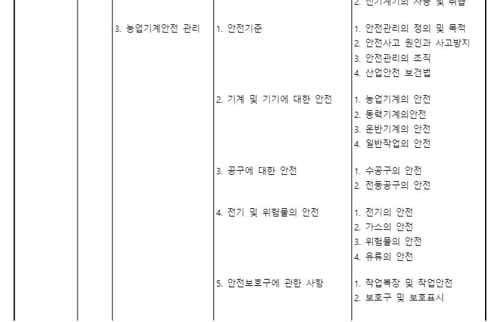 농업기계운전에 요구되는 농업기계에대한 내용과 농작업에 관한사항, 농업기계전기 지식,안전관리등에 대한 과목이 나옵니다.