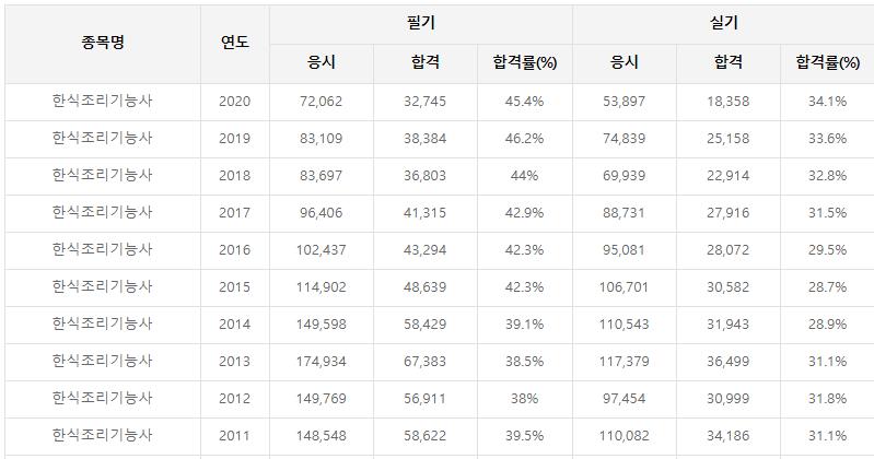 한식조리기능사 시험은 매년 응시자가 7~10만명으로 많이 응시하는 시험이기도하지만 합격률은 필기는 40%내외, 실기는 30%내외로 생각외로 쉬운 시험이 아닌듯합니다.