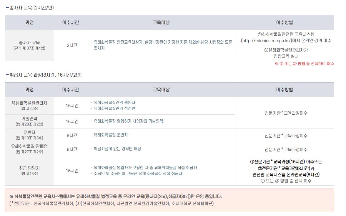해당홈페이지에 들어가면 취급자교육,국내종사자교육, 외국인 교육을 온라인으로 들을수 있는 페이지와 화학사고 전문교육,기술인력 전문교육,민간법정교육 등 집합교육으로 신청할수 있습니다.