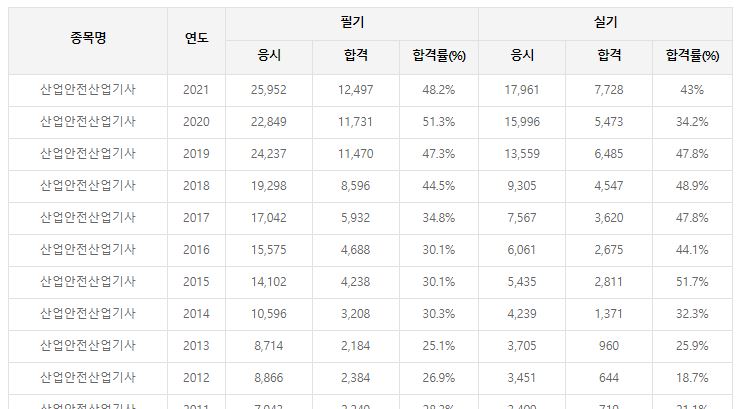 산업안전기사는 산업안전산업기사 다음 난이도의 자격증으로 매년 3만여명이 응시할 정도로 인기가 많은 시험입니다. 또한 응시자 수도 점차 갈수록 늘어나며 산업 안전에 관한 중요도가 늘어