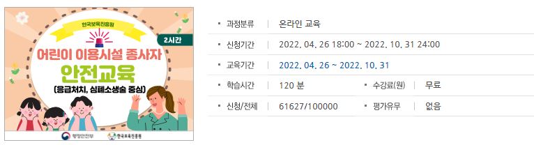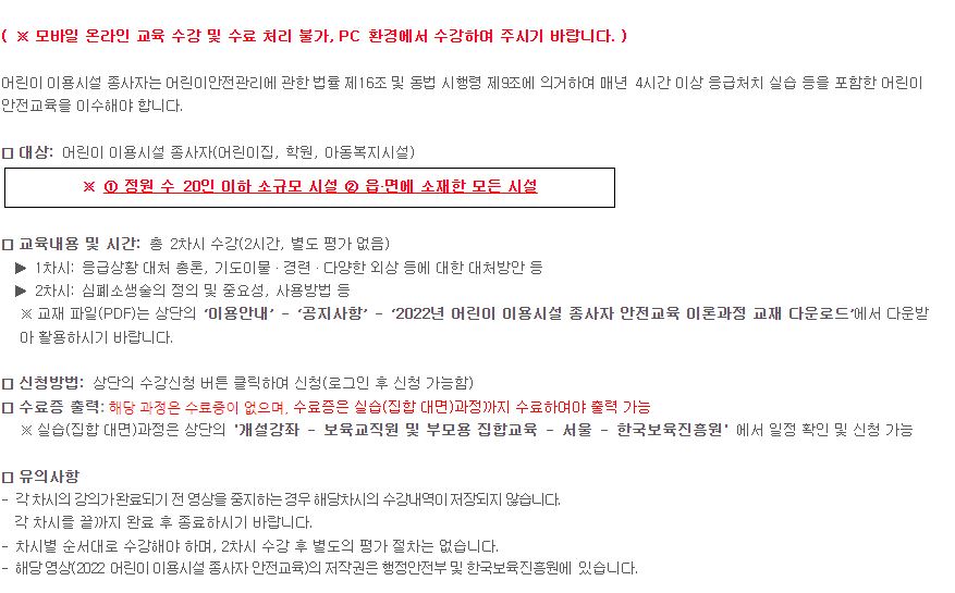 응급상황과 행동요령은 온라인으로 교육을 이수할 수 있습니다. 다만 소아 심폐소생술을 포함한 응급처치 실습교육은 집합교육으로 실습교육을 이수해야합니다.