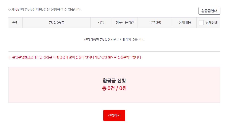 만약 환급금을 받을 금액이 있다면 신청 할수 있는 내역이 나타납니다.