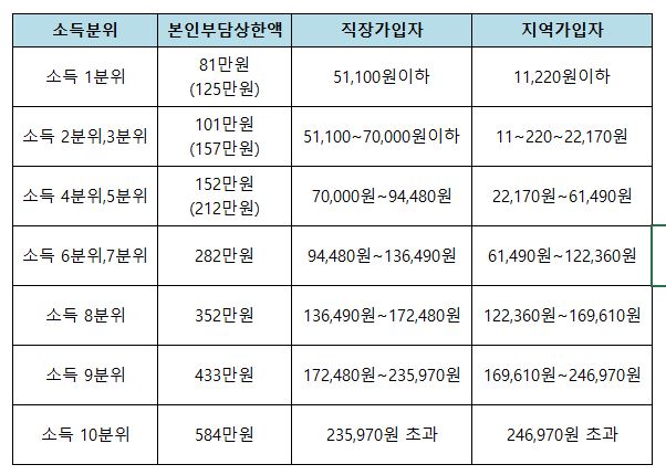 소득 1분위~소득 10분위에 따라 직장가입자,지역가입자 납부 금액에 따라 본인부담 상한액이 달라집니다.