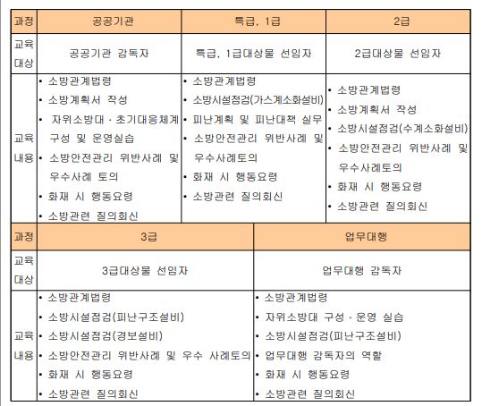 방화관리자는 공공기관,특급,1급,2급,3급,업무대항별로 교육내용에 차이가 있습니다.