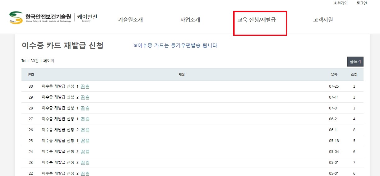 내가 교육받은 교육기관 홈페이지로 가면 이렇게 이수증 재발급을 요청 할수 있는 페이지가 따로 마련되어있기도 합니다.