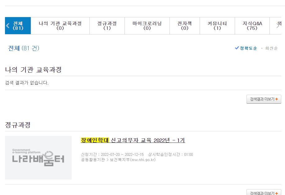 나라배움터 사이트에서 [장애인 학대 신고의무자 교육]을 검색합니다.