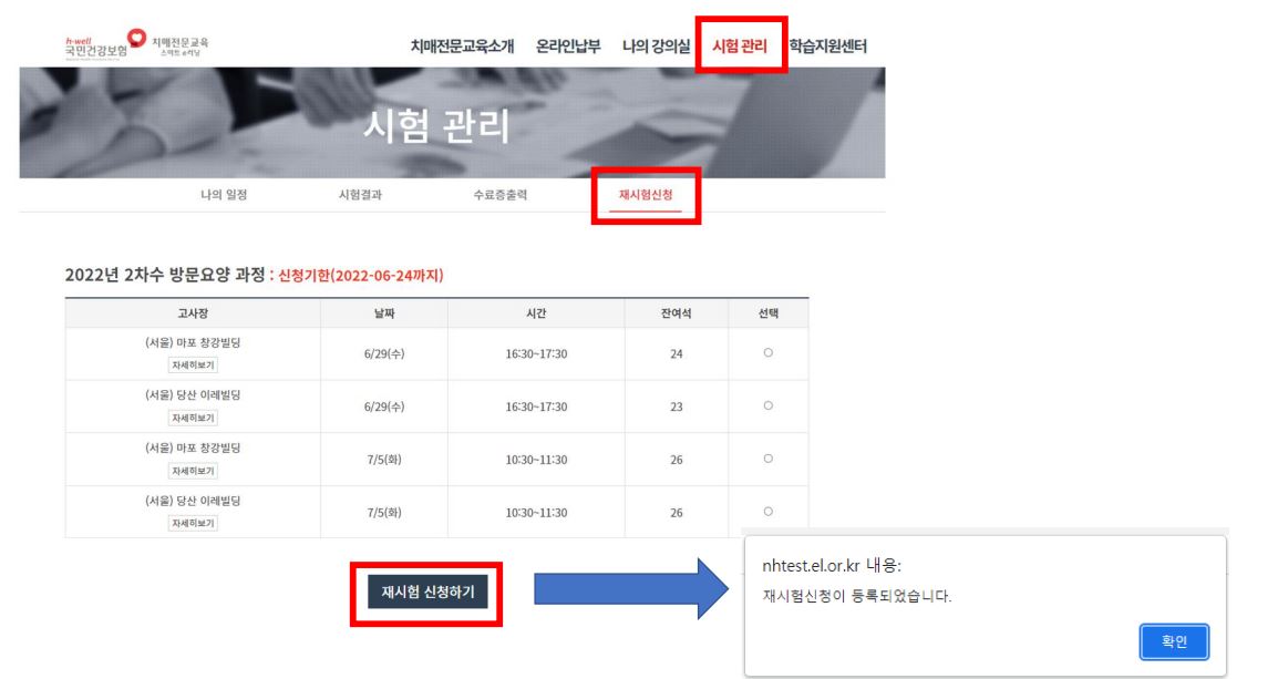 재시험은 치매전문교육 스마트 e러닝 홈페이지에서 [시험관리]-[재시험신청]에서 강의실을 선택한후 재시험을 신청할 수 있습니다.