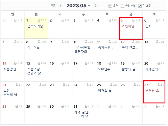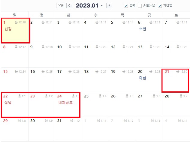 2023년 법정공휴일(빨간날 쉬는날)