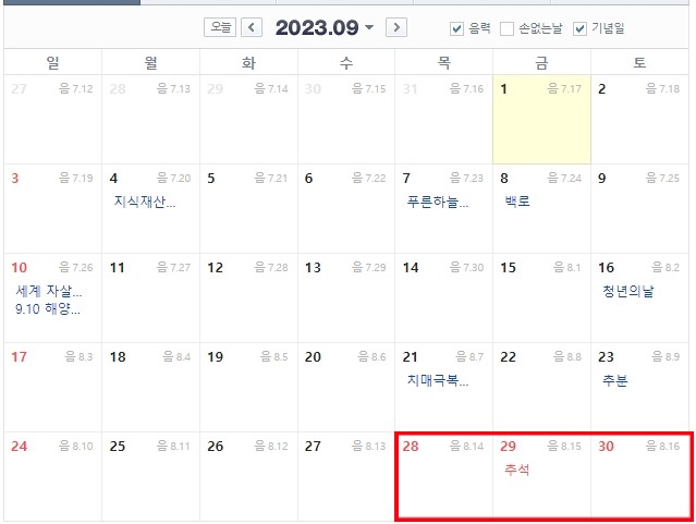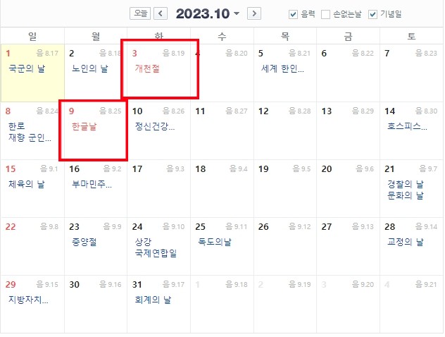 9월 28일,29일,30일이 추석이며 10월 3일은 개천절, 10월 9일 월요일은 한글날로 빨간날 입니다.