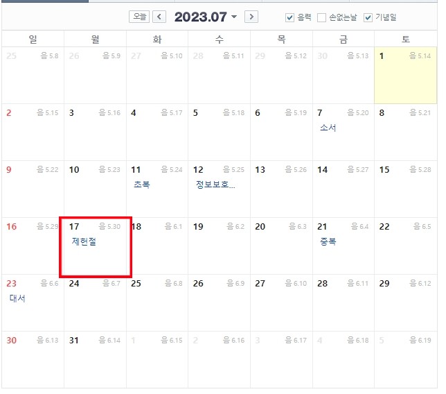 2023년 7월 17일 제헌절은 빨간날이 폐지되어 쉬는날이 아닙니다.