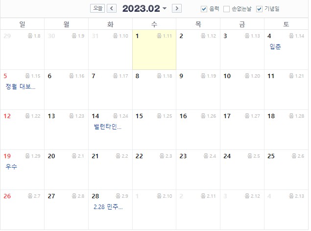 2월에는 아쉽게도 일요일 토요일 외에 공휴일이 없습니다.