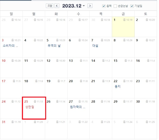 12월 25일 월요일은 성탄절 크리스마스로 빨간날 입니다.