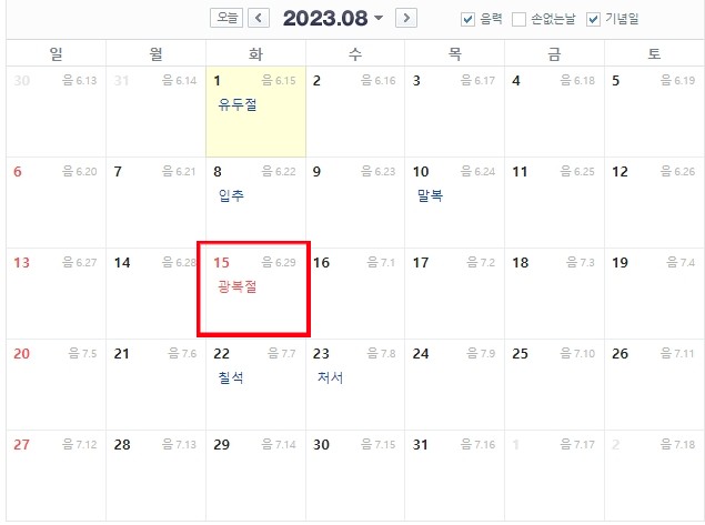2023년 8월은 8월 15일 광복절 화요일이 공휴일입니다.