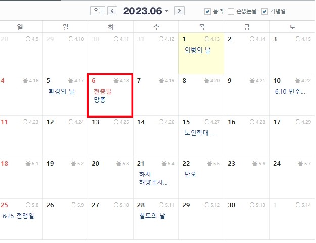 6월은 6월 6일 화요일 현충일로 법정공휴일 입니다.