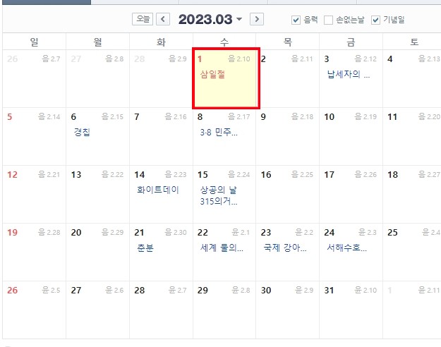 3.1삼일절이 수요일로 빨간 쉬는날 입니다.
