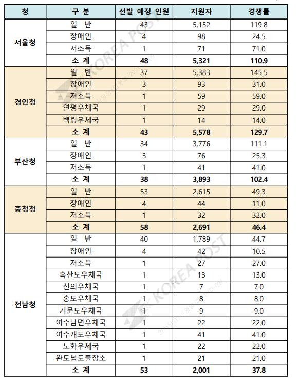 우체국은 전국에 서울청,경인청,부산청,충청청,전남청,경북청,전북청,강원청으로 각 지역마다 티오를내 체용하게 됩니다.