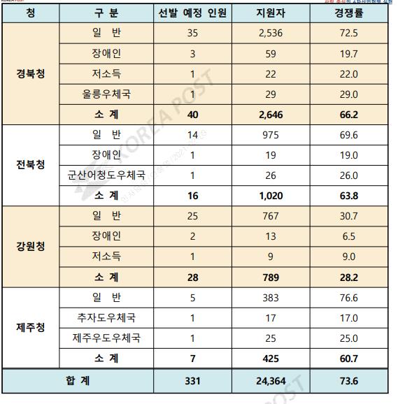 전국적으로 331명 채용에 24,364명이 응시하여 경쟁률이 73.6:1일 정도로 9급 공무원으로 경쟁률이 치열한 시험이기도 합니다.