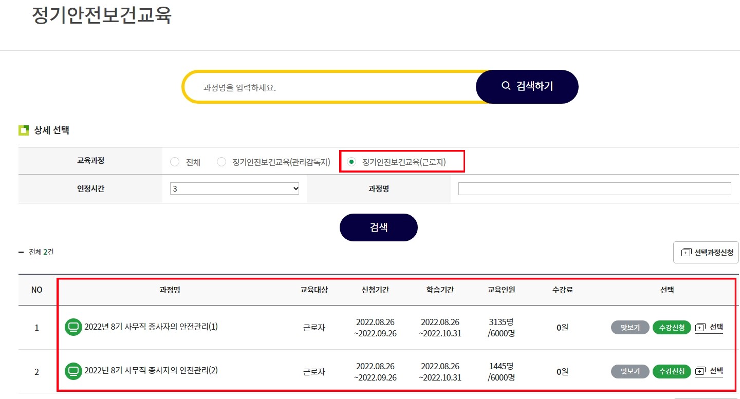 정기안전보건교육에서 근로자를 선택하면 사무직 종사자 안전관리 교육을 이수 할수 있습니다.