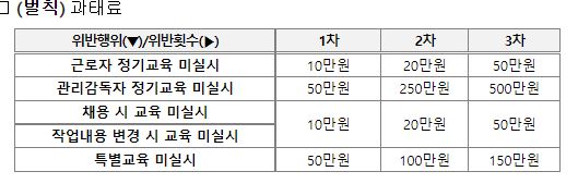 | 근로자 정기교육 미실시 | 10만원 | 20만원 | 30만원 |