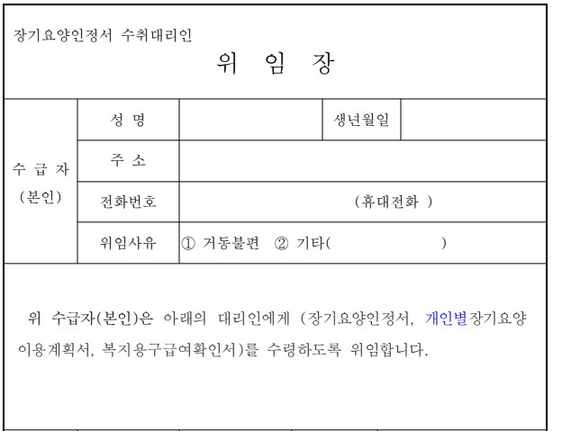 장기요양인정서 수취대리인 위임장 양식 입니다.