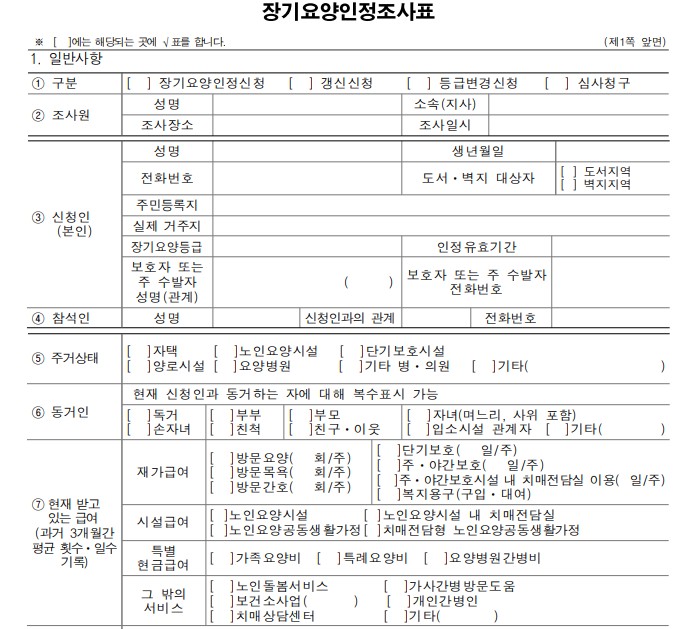 장기요양인정조사표 양식은 아래 첨부파일을 다운받아 참고 하실 수 있습니다.
