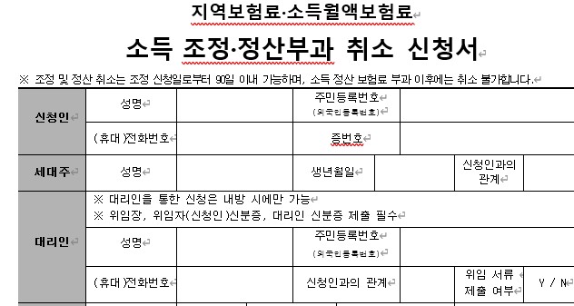 건강보험 지역보험료 소득월액보험료 소득 조정 정산부과 취소신청서 서식 다운로드(지역가입자)