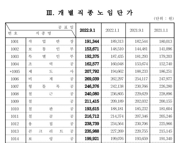 2022년 하반기 적용 정부 노임단가표 발표 내용입니다.