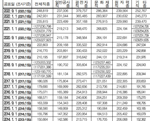 | 조력공 | 162,577 | 판넬조립공 | 205,422 | 지적기사 | 250,962 |