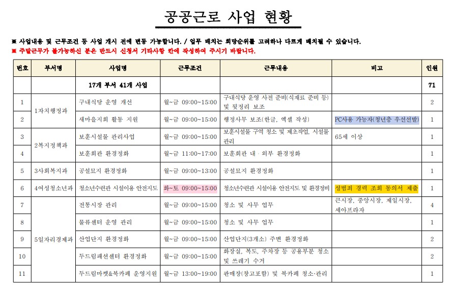 주로 구내식당 새미을 지회 행정보조 제초작업,환경정화,시설관리, 청소 및 사무 업무,카페 바리스타, 문화재 관리, 방역보조, 쓰레기 청소 수거, 차량출입관리, 재활용품 선별작업,안내응대 도서정리 등 업무를 모집하고 있습니다.
