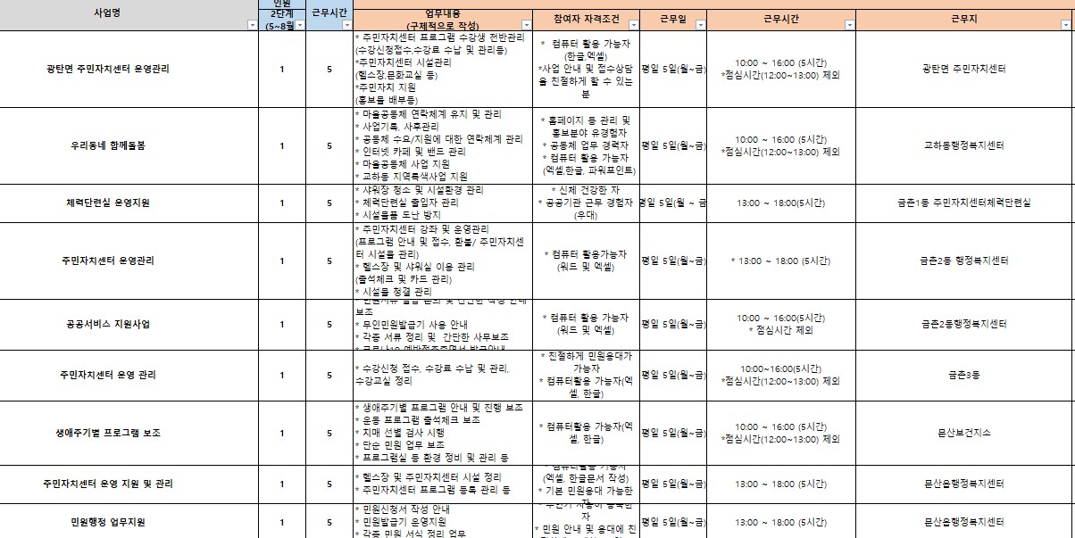 위 처럼 사무보조 시설관리 지원 시설환경 관리 청소, 도난방지,출입자 관리,실버카페 바리스타, 경로당 업무지원,전산업무 보조등의 업무를 모집하고 있습니다.