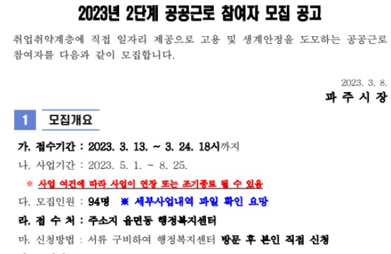 파주시청 홈페이지(www.paju.go.kr)에서는 저소득층 및 노인 분들을 대상으로한 공공근로 일자리 사업을 매년 2~3차례씩 모집합니다.