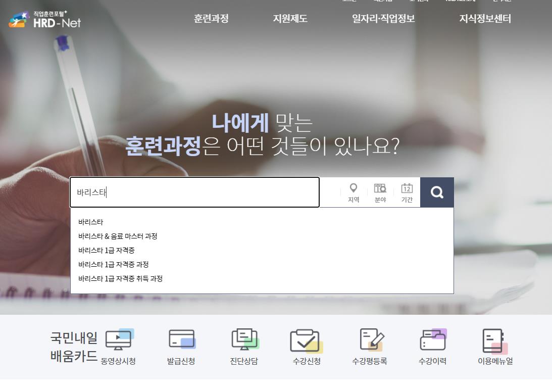 직업훈련포털인 HRD.net에서 바리스타를 검색하면 다양한 바리스타 자격증 취득과정을 찾아볼수 있습니다.
