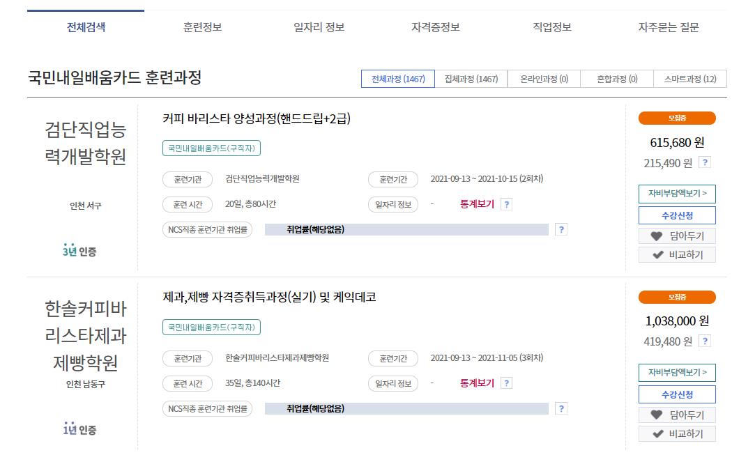 나에게 맞는 국비지원 금액을 확인후 바리스타 자격증 학원에서 바리스타자격증을 따볼수도 있겠네요.