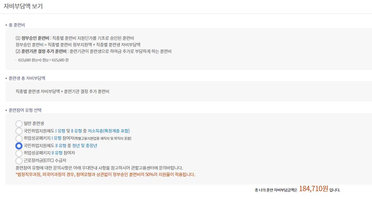 국민취업지원제도나 취업성공패키지,근로장려금 수급자일경우에는 좀더 많은 국비지원을 받을수 있습니다.